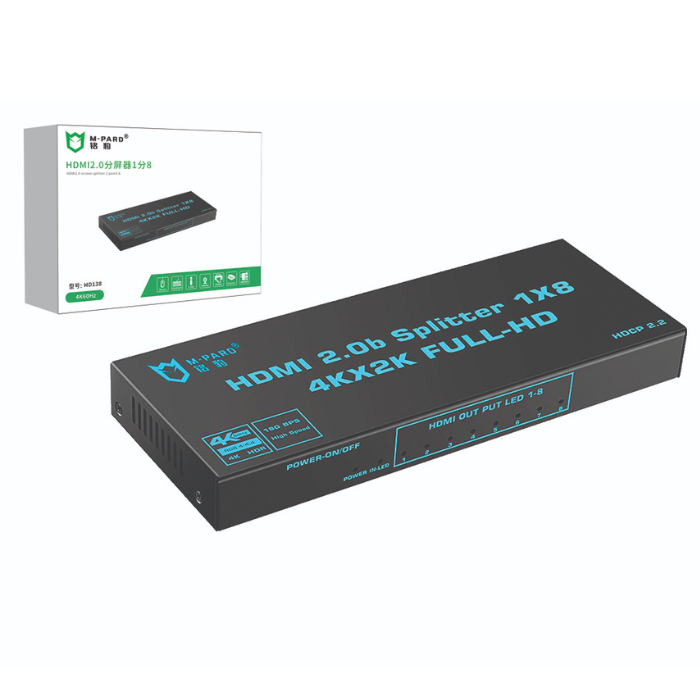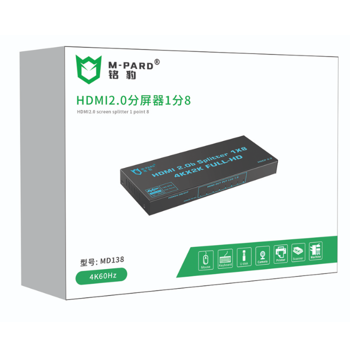 HÃNG SẢN XUẤT M-PARD MÃ SẢN PHẨM MD138 CỔNG VÀO 1 CỔNG HDMI CỔNG RA 8 CỔNG HDMI MÀU ĐEN ĐỘ PHÂN GIẢI 4KX2K FULL HD NGUỒN DC 5V