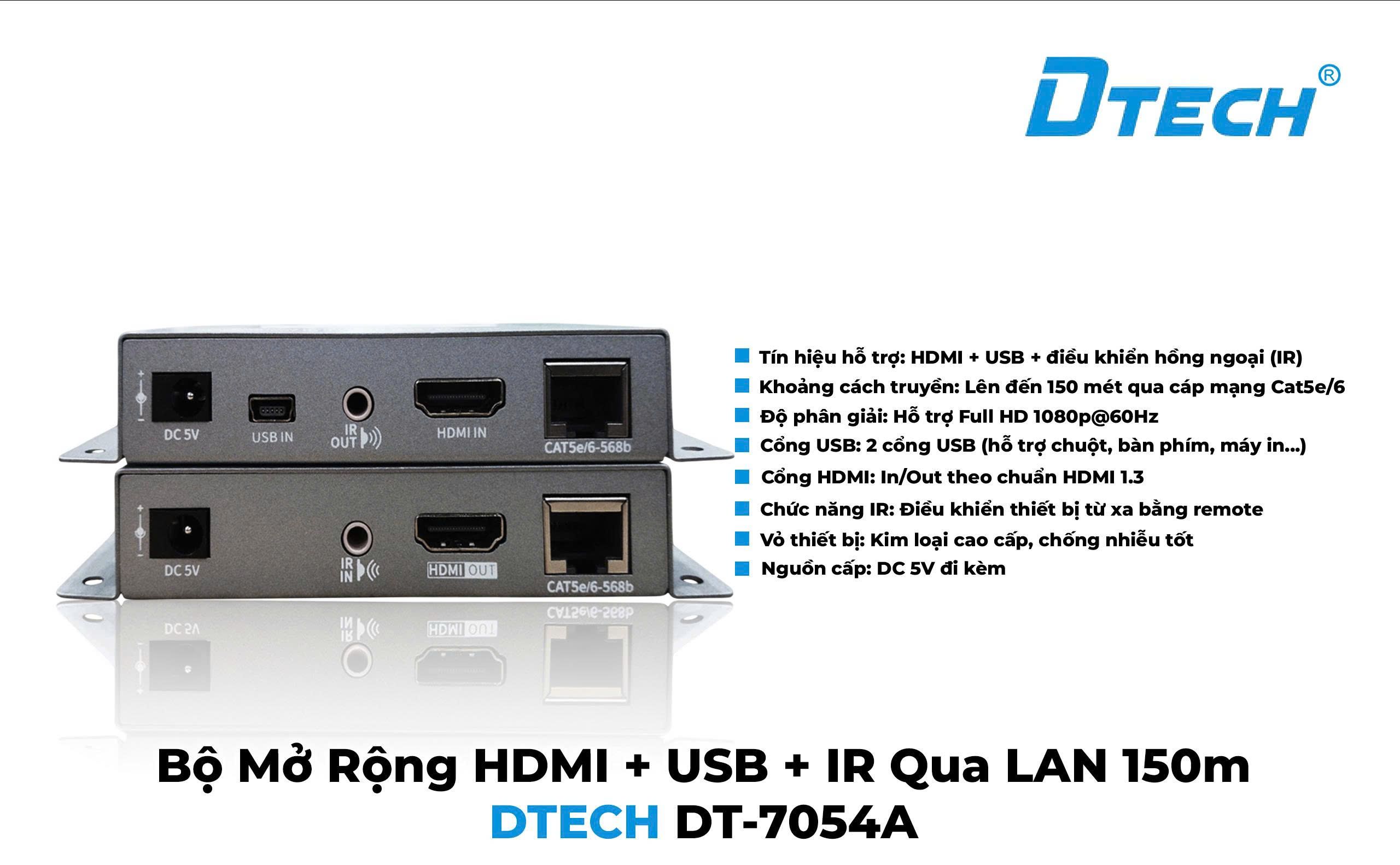 - Bộ khuếch đại HDMI và USB 150M qua cáp mạng DTech DT-7054A hỗ trợ độ phân giải cao FullHD 1920*1080P giúp bạn kết nối Đầu Ghi Hình Camera, CCTV, Tivi Box, Pc, Laptop... với màn hình máy chiếu, TIVI và các thiết bị trình chiếu khác qua cổng HDMI với cự ly xa lên đến 150M. Điểm đặc biệt của bộ kéo dài hdmi này là có tích hợp hai cổng USB giúp bạn có thể kết nối chuột, bàn phím để điều khiển các thiết bị ngay tại màn hình hiển thị, không cần đi riêng hệ thống khuếch đại USB bên ngoài. Đối với các thiết bị sử dụng điều khiển hồng ngoại (IR) như đầu thu hình camera, Dtech DT-7051A còn hỗ trợ mắt đọc hồng ngoại, bạn cũng có thể kiểm soát thiết bị tại thiết bị đầu cuối.