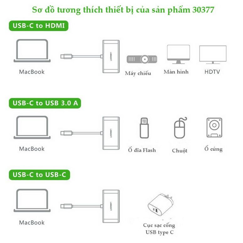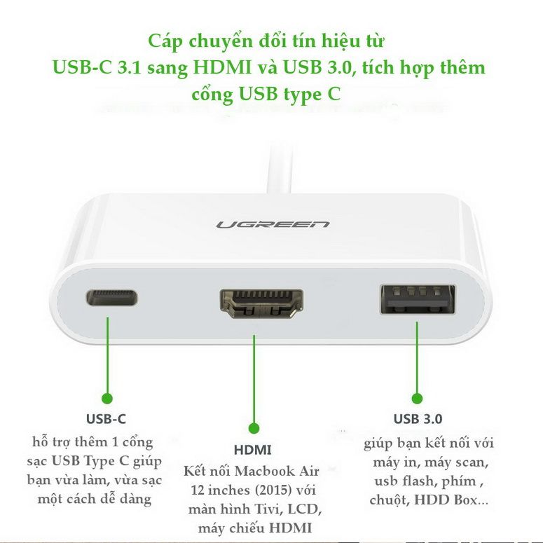 - Ngoài khả năng trình chiếu hình ảnh, âm thanh chất lượng cao tới các màn hình HDTV, Cáp chuyển USB-C to HDMI Ugreen 30377 còn được tích hợp kèm 1 cổng USB 3.0mang đến khả năng kết nối các thiết bị ngoại vi như ổ cứng di động, chuột, bàn phím, camera... với máy tính của bạn với tốc độ truy xuất dữ liệu số lên đến 5Gbps.