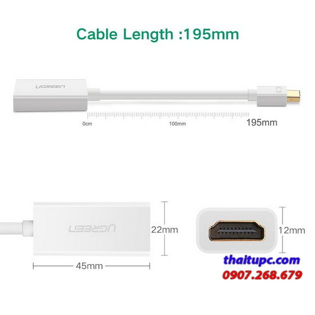 - Cable Mini DisplayPort sang HDMI Ugreen 10460 có khả năng chuyển đổi âm thanh và hình ảnh cùng lúc. Hỗ trợ độ phân giải lên tới 1920x1200, 1920x1080 (HD1080P). Âm thanh không nén 2 kênh Stereo, 5.1, 7.1. giúp bạn mở rộng không gian làm việc khi có nhu cầu kết nối ra màn hình lớn hơn, xem phim trên Tivi từ laptop, trình chiếu, hội họp trực tuyến... Ứng dụng cho văn phòng, cơ quan, gia đình, trường học. Cáp dài 18cm, nhỏ gọn giúp bạn bảo quản dễ dàng. với cáp Mini Displayport dương sang HDMI âm, bạn cần mua thêm cáp HDMI để kết nối. Dây cáp HDMI có tốt không ?