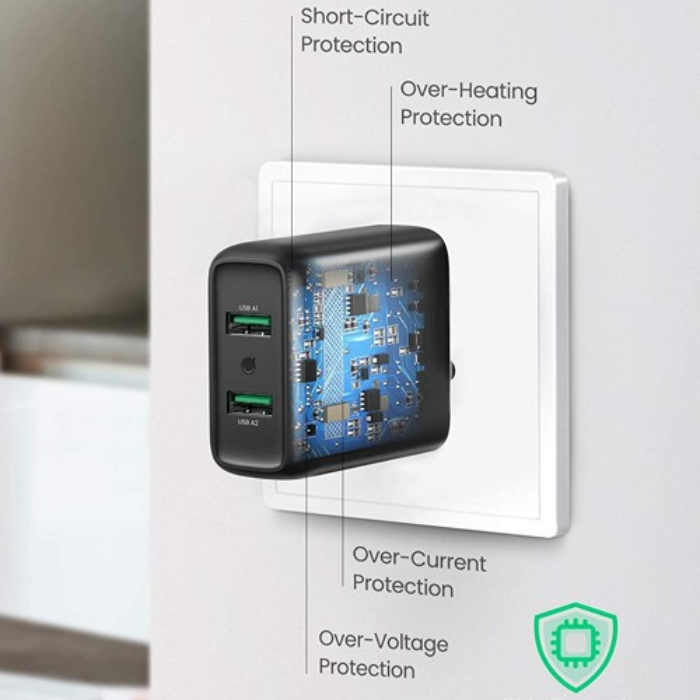 Bộ sạc USB thông minh Ugreen 70151: Hỗ trợ sạc QC, cũng AFC, FCP và BC 1.2. Đồng thời hỗ trợ sạc tiêu chuẩn cho các thiết bị sạc không nhanh như iPhone, iPad, máy tính bảng, pin sạc dự phòng tối ưu.