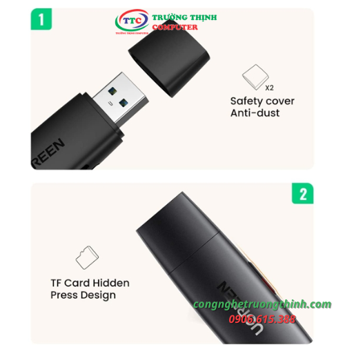 Tính năng với khe cắm thẻ kép SD và TF (Micro SD), Ugreen 80191 hỗ trợ đọc và ghi 2 thẻ đồng thời. Nó tương thích với thẻ nhớ trên Máy quay phim, DashCam, Máy ảnh thể thao, Máy ảnh DSLR, Màn hình, Máy bay không người lái, Máy ảnh kỹ thuật số, có thể truy cập vào lightroom hoặc phát lại video trực tiếp trên điện thoại / máy tính bảng của bạn.