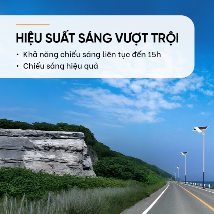 - Đèn đường năng lượng mặt trời được trang bị pin LiFePO4 chất lượng cao, mang lại độ an toàn vượt trội, tuổi thọ dài lâu và hiệu suất ổn định trong suốt quá trình sử dụng cho thời gian chiếu sáng liên tục 12 – 15 giờ. Bên cạnh đó, tấm pin Mono hiện đại có khả năng hấp thụ ánh sáng tối ưu, giúp đèn hoạt động hiệu quả ngay cả trong điều kiện thời tiết ít nắng hoặc ánh nắng không ổn định. Đây là giải pháp bền vững, thân thiện môi trường và phù hợp với nhiều khu vực lắp đặt khác nhau.