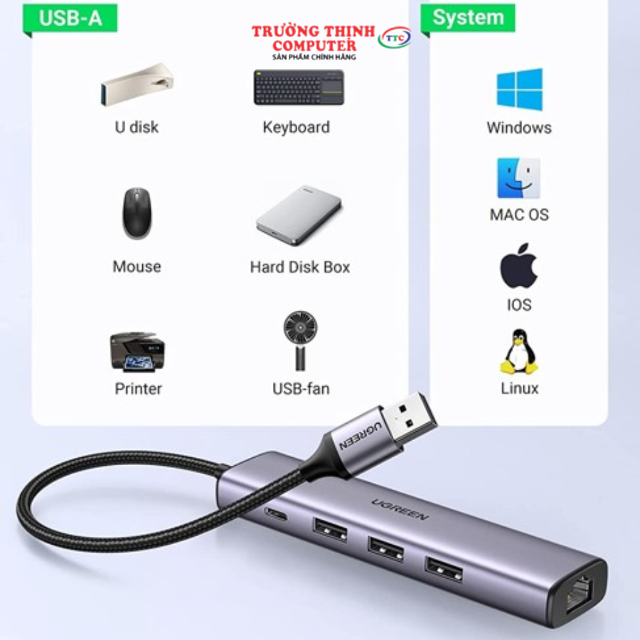 - Ugreen 60554 USB 3.0 to Ethernet Adapter được trang bị một cổng Gigabit Ethernet và 3 cổng USB 3.0. Vừa cung cấp cho thiết bị của bạn một mạng có dây ổn định, vừa có thể mở rộng thêm nhiều phụ kiện. Nó cũng được trang bị cổng cấp nguồn Type-C để bạn có thể sử dụng một số thiết bị công suất lớn.