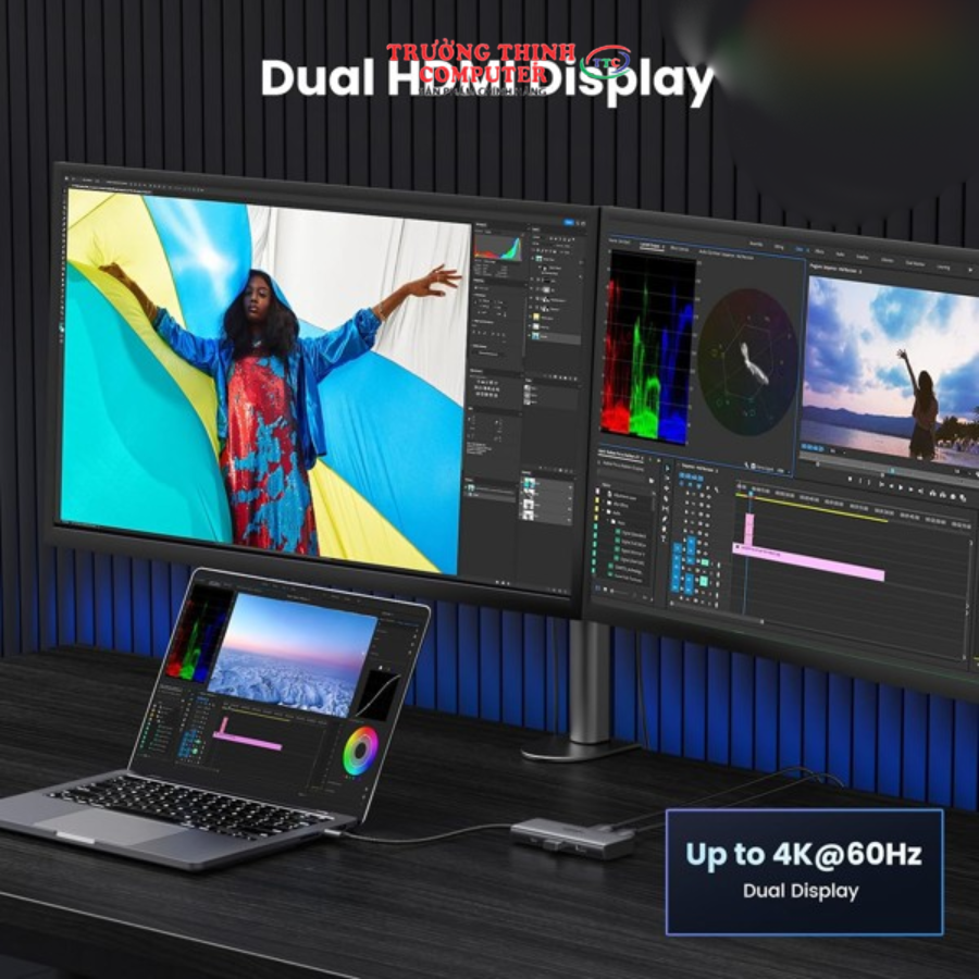 - Docking Station Ugreen 15852 sẽ kết nối 2 màn hình với cả hai cổng HDMI ở tốc độ tối đa 4K@60Hz, giúp thực hiện đa nhiệm trên nhiều màn hình và quy trình làm việc sáng tạo hiệu quả hơn nữa. (Thiết bị của bạn phải hỗ trợ đầu ra màn hình trên USB-C)