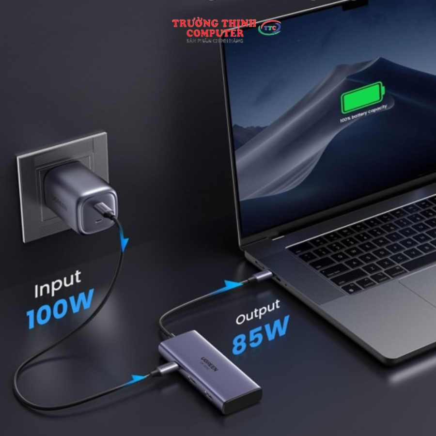 - Hỗ trợ sạc qua USB-C tối đa 100w và sạc vào máy 85W qua cổng USB-C PD, do đó bạn có thể sạc MacBook Pro 13 từ mức pin yếu đến 73% trong một giờ.