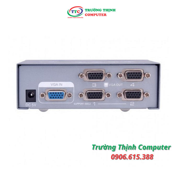 - Bộ chia tín hiệu VGA 1 ra 4, 250Mhz : cho phép bạn chia (1 CPU ra 4 màn hình), một thiết bị có cổng ra cắm cáp VGA ra 4 thiết bị có đầu vào là 4 cổng VGA 15 chân.