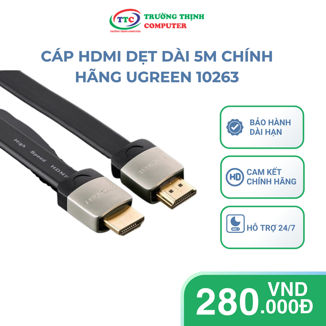 - Cáp HDMI dẹt dài 5m Ugreen được sản xuất theo công nghệ hiện đại, cho chất lượng tín hiệu hình ảnh sắc nét, âm thanh sống động. Độ phân giải hình ảnh được hỗ trợ tới HD, Full HD, 2K, 4K, 3D. Chất lượng âm thanh số Digital Audio cao cấp.