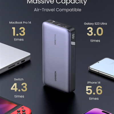 đi kèm với viên pin dung lượng lớn 25.000mAh và tổng công suất đầu ra là 145W! Sạc đầy pin cho máy tính xách tay lên tới 1,3 lần và thiết bị di động lên tới 5,6 lần.