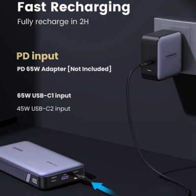 Dễ dàng sạc lại pin dự phòng 25.000mAh này trong 2 giờ bằng bộ sạc PD 65W (không bao gồm). Với công nghệ hai chiều của chúng tôi, các thiết bị sẽ được sạc nhanh trong khi sạc nhanh bộ sạc di động này.