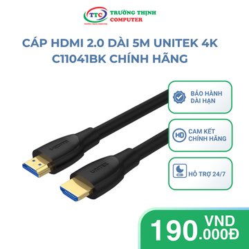 - Cáp HDMI 5m UNITEK có đầu cáp mạ vàng, cộng với bảo vệ bao gồm bụi, cắm-và-play, hot swappable, ổn định tín hiệu truyền.