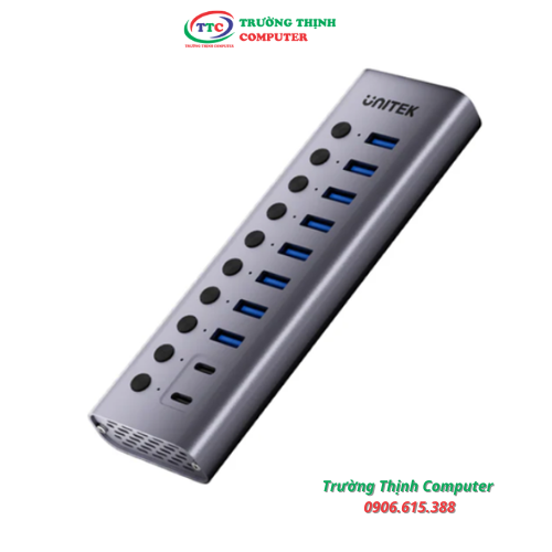 - Bộ chia USB (Hub) UNITEK H1315B01-EU là một hub đa cổng với 8 cổng USB-A và 2 cổng USB-C chạy ngang trên cùng. Mỗi cổng có một nút có thể nhấn để bật cổng đó. Nó không chỉ tiết kiệm năng lượng mà còn cải thiện tính bảo mật. Vỏ nhôm, USB-A và USB-C 5Gbps và Sạc nhanh BC1.2.