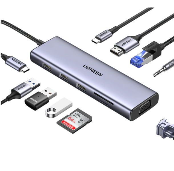 8. Bộ chuyển đổi USB C to HDMI + VGA + LAN 1Gbps + Hub USB3.0 + SD/TF + Audio Ugreen 80133